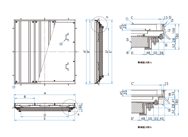 | 型式 | D×D' | A×A' | B×B' | C×C' | E×E' | 蓋枚数 | 蓋1枚kg | 充填時蓋kg | 耐火材中蓋kg | 合計重量kg |