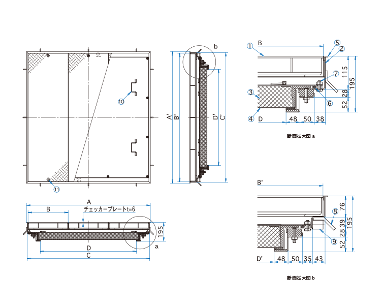 | 型式 | D×D' | A×A' | B×B' | C×C' | 蓋枚数 | 蓋1枚kg | 耐火材中蓋kg | 合計重量kg |