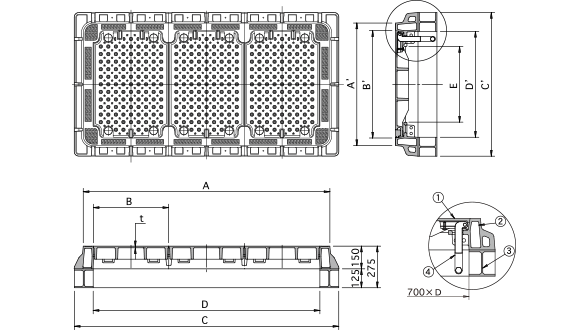 | 型式 | 蓋枚数 | D×D' | A×A' | B×B' | C×C' | E | t | E | 蓋1枚kg | 合計重量kg |
